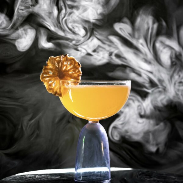 Add gin and both juices to a cocktail shaker with ice and shake to combine. Strain into a chilled coupe glass, add bitters, and garnish with a dried pineapple slice.