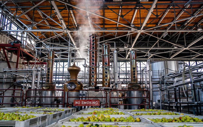 We distill our flagship pear brandy up to 95.1% ABV, blend the resulting distillate with non-GMO grain neutral spirit, then filter before bottling.