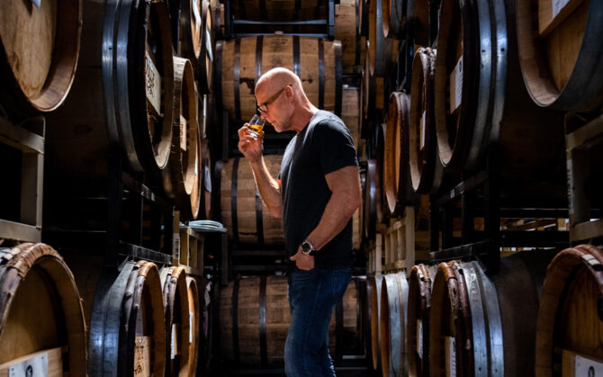 For the upcoming Lot 25 blend (rolling out November 2025), Dave selected 28 casks out of 2,000 in our rickhouse, including used American oak barrels that previously held bourbon and rye; French oak barrels that previously held apple brandy, rum, and Port; and California Sauternes-style wine casks. The oldest single cask in Lot 25 is 13 years old, while the youngest cask is five years old.