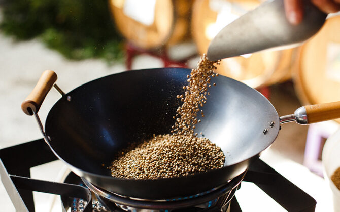 We distill fir and sage separately from the other ingredients to minimize impacts from seasonal variations. Fresh California bay laurel leaves and juniper are vapor-infused. The other botanicals (including coriander seeds we wok-roast) go right in the pot of our still.